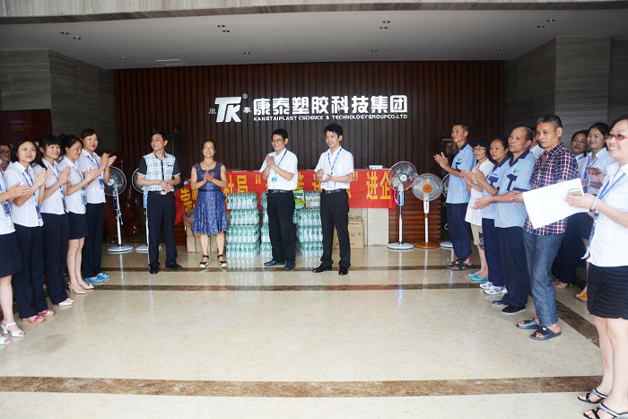 8月7日下午,崇州市人力資源和社會保障局副局長、工會主席李茂清帶領(lǐng)局“送清涼”慰問組,來到康泰塑膠科技集團有限公司,工會主席吳彬及人事行政中心呂旭梅經(jīng)理接待了慰問組。人社部門為公司職工送上了電風扇、礦泉水、和防暑物品,并將有關(guān)勞動安全、工資待遇等內(nèi)容的人社政策宣傳資料送到職工手中,使職工進一步了解有關(guān)政策法規(guī),依法主動保護自身合法權(quán)益。