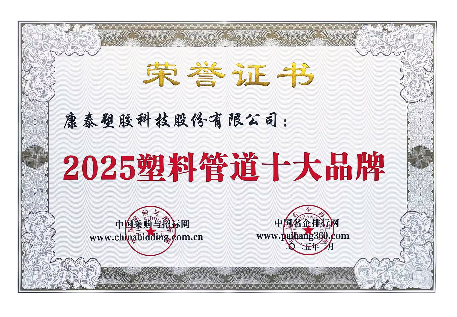 康泰集團榮膺中國輕工塑料管道行業(yè)十強企業(yè)2025/07/28 3543近日,中國塑料加工工業(yè)協(xié)會公布中國輕工塑料管道行業(yè)十強企業(yè)入圍名單,康...read more